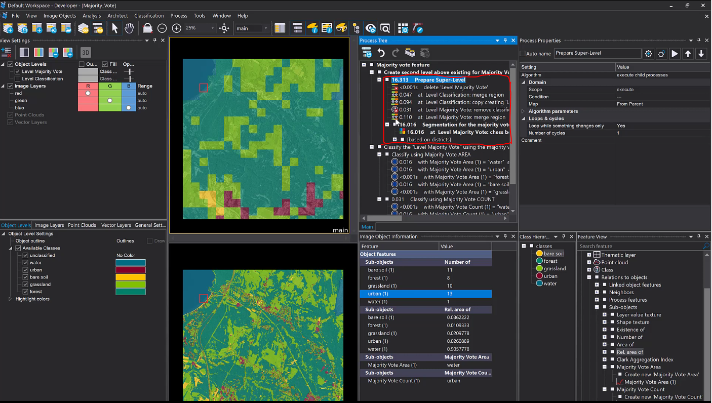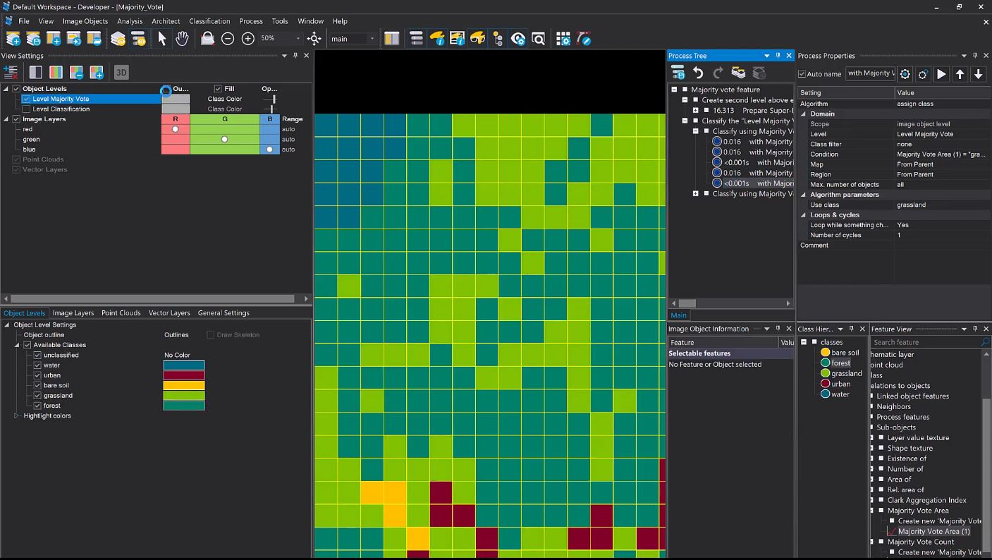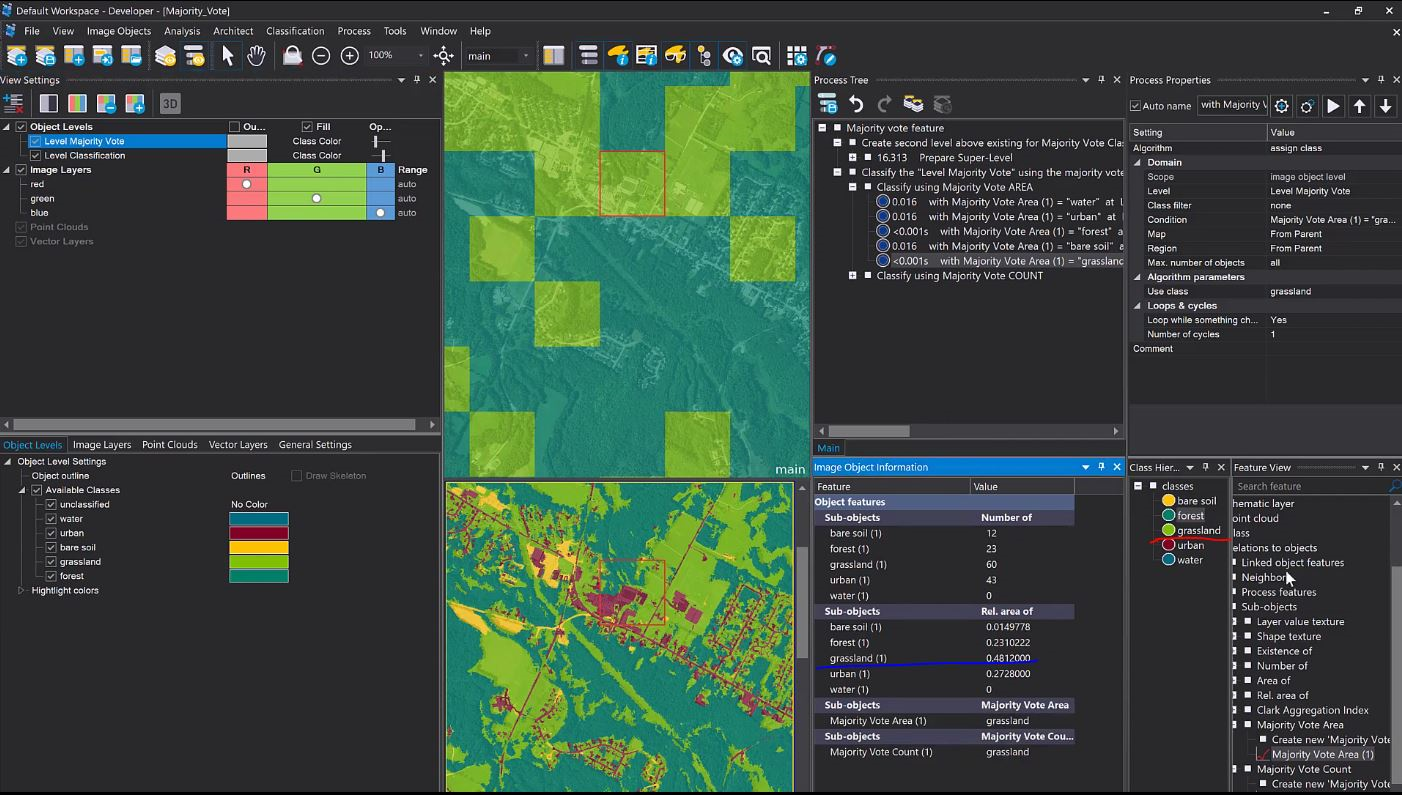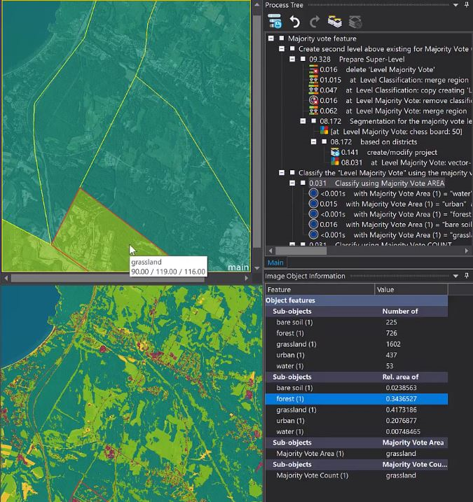 5. 同时打开影像对象信息窗口,观察多数投票特征值中土壤、森林、草地、城镇、水体5大因子的变化。以草地因子为例:多数投票的父层级显示类别为草地类型,子层级显示为混合类,通过对象信息框可以看到草地因子的子对象面积为5类因子中占比最大,故投票区为草地类型