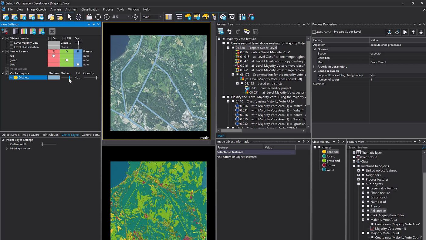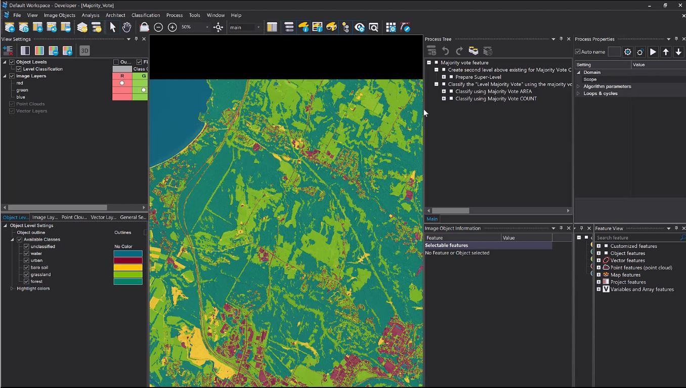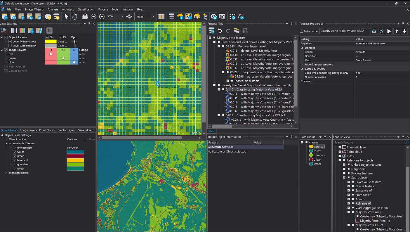 5. 同时打开影像对象信息窗口,观察多数投票特征值中土壤、森林、草地、城镇、水体5大因子的变化。以草地因子为例:多数投票的父层级显示类别为草地类型,子层级显示为混合类,通过对象信息框可以看到草地因子的子对象面积为5类因子中占比最大,故投票区为草地类型