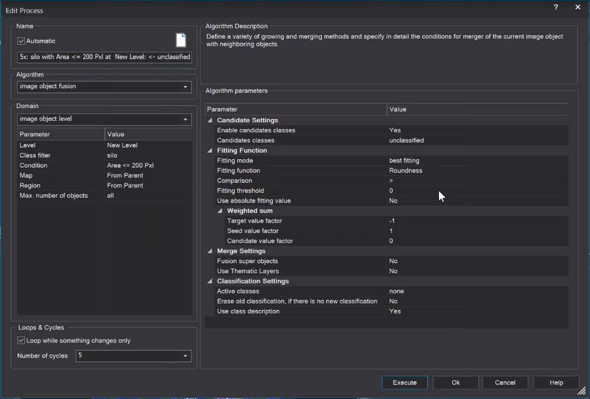 2 影像对象融合规则集设置,在soil类别中,当选择了roundness拟合特征后,会自动生成拟合阈值和对象之间的权重值,点击执行,结果视图中下方的是执行规则集后的效果