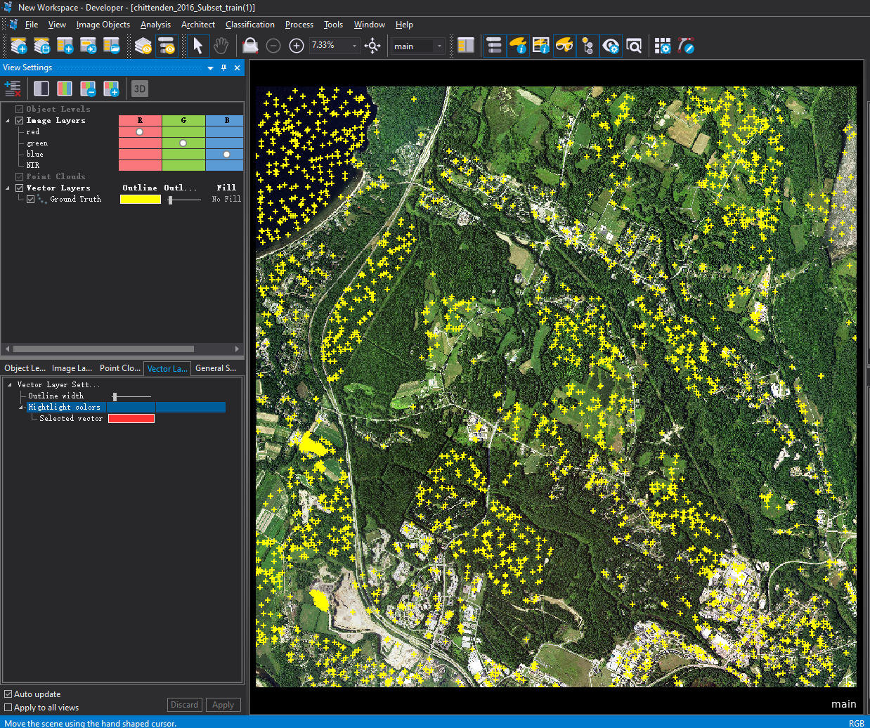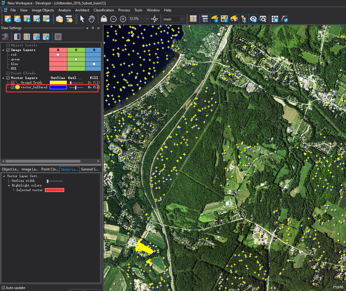 在eCognition软件中创建工作空间与样本采集工程,导入要采集样本的遥感航测影像与参考的矢量数据。