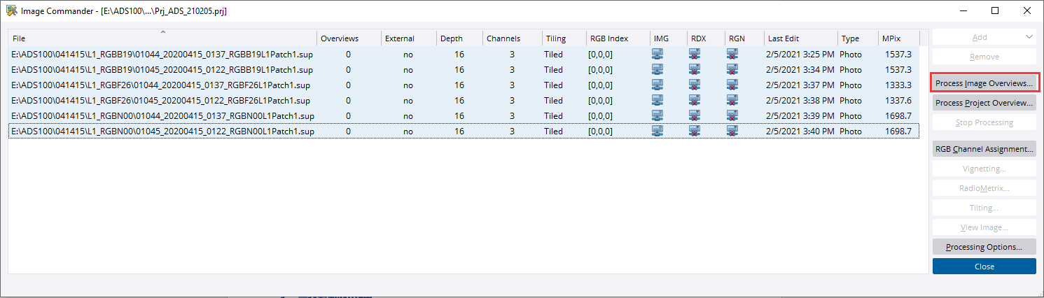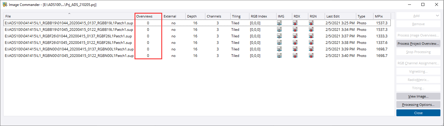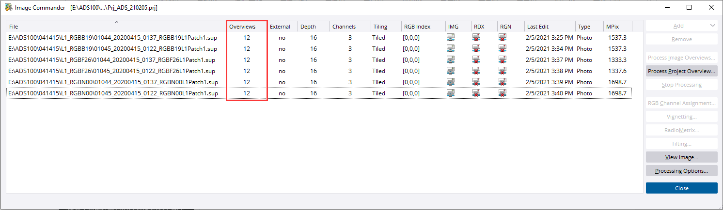 选中影像命令器中的影像文件,点击“Project Image Overviews”进行金字塔创建。